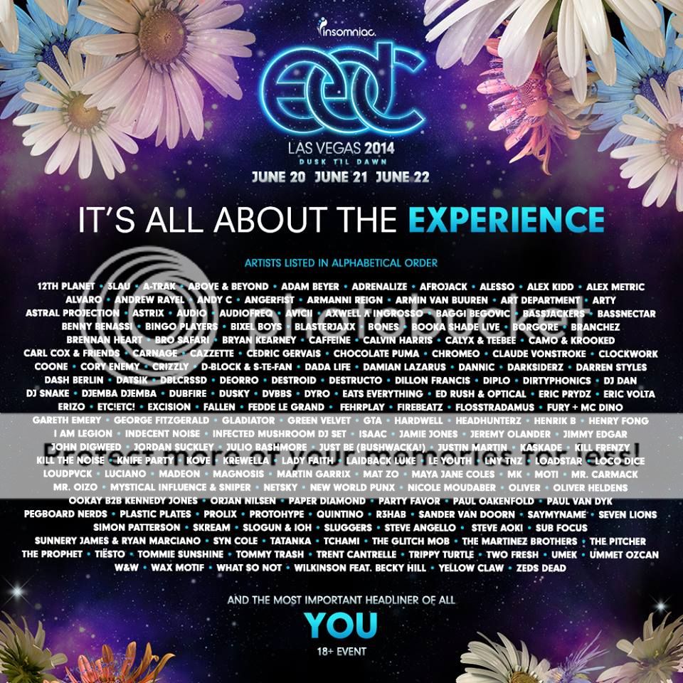 During the chaos of Memorial Day Weekend, Insomniac Events teased EDC Las Vegas attendees with some confirmed artists like New World Punx, Cedric Gervais, Hardwell, and many others via Snapchat. Mere glimpses of the complete answer to the burning question of “Where’s the lineup?”, the trickle of names served well to further stir the anticipation for the great reveal today. And, here we are. FINALLY, the Electric Daisy Carnival Las Vegas 2014 lineup is announced! After months of waiting, wearing out the refresh button all day, and little playful trolling from Pasquale and company, our patience has been rewarded. Feast your hungry eyes upon the smorgasbord of talent that will serve as the soundtrack to our weekend underneath the electric sky.