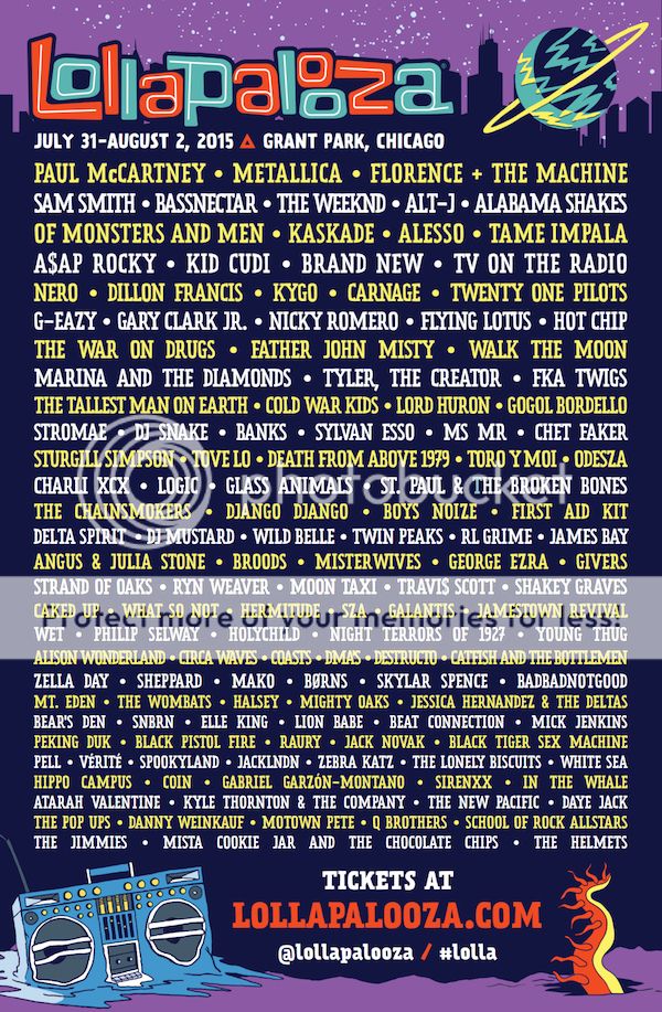 Metallica, Sam Smith, Alesso, Tame Impala, Kid Cudi, Brand New, Carnage, G-Eazy, Walk The Moon, Tyler The Creator, The Tallest Man On Earth, Banks, Chet Faker, Sturgill Simpson, Death From Above 1979, Toro Y Moi, Charli XCX, Django Django, Boys Noize, Delta Spirit, RL Grime, Givers, Ryn Weaver, Travi$ Scott, CAKED UP, Hermitude, Wet, HOLYCHILD, Catfish And The Bottlemen, Zella Day, Mt. Eden, Jessica Hernandez & The Deltas, SNBRN, Elle King, Beat Connection, Mick Jenkins, Raury, Jack Novak, Pell, White Sea, Hippo Campus, COIN, Danny Weinkauf, School Of Rock AllStars, The Jimmies, Mista Cookie Jar & The Chocolate Chips, The Helmets