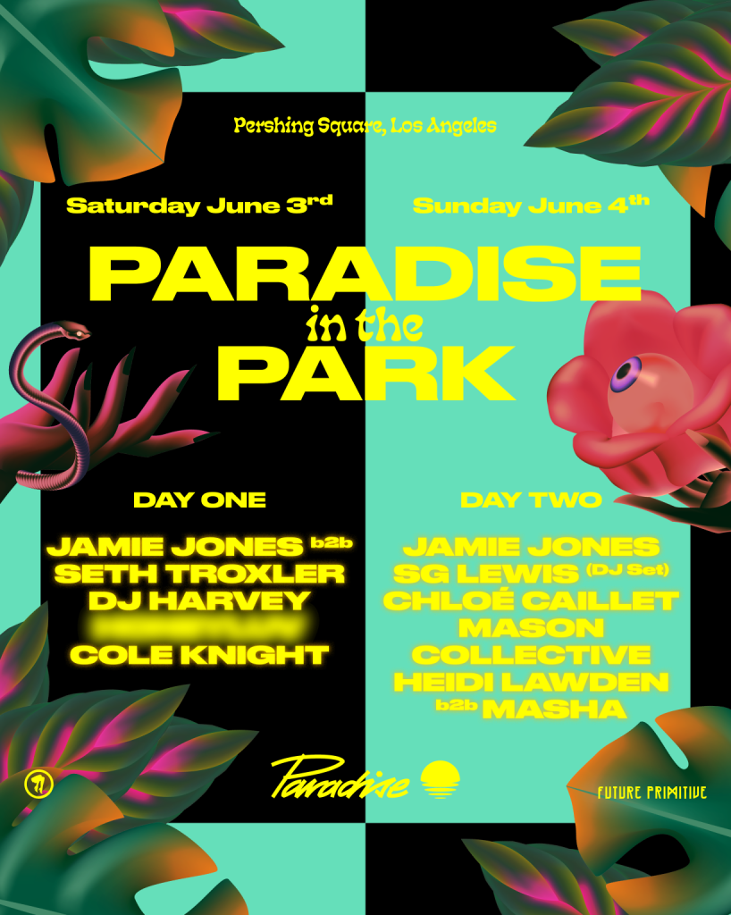 Paradise In The Park is held in collaboration with A Club Called Rhonda and expertly curated by house music boss Jamie Jones. The event will feature an infectious b2b set from Jamie and Detroit techno veteran Seth Troxler on day one. The lineup continues with eclectic sets from the legendary DJ Harvey and multi-instrumentalist DJ Cole Knight, set to the backdrop of the DTLA skyline. The top-tier musical curation continues on June 4th as Jamie will be joined by British singer-songwriter, multi-instrumentalist, and producer SG Lewis (DJ Set), Parisian DJ and XCESS records founder Chloe Caillet, dynamic trio Mason Collective, and a b2b set from LA underground icons Heidi Lawden and Masha.