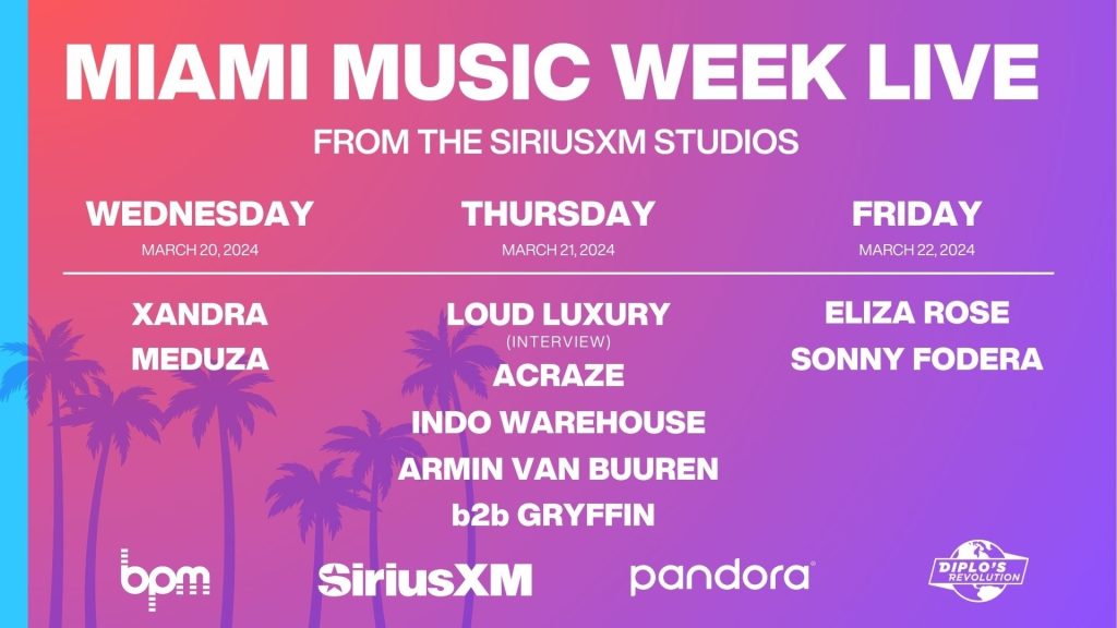 SiriusXM BPM Live in Miami with Loud Luxury, ACRAZE & Indo Warehouse: Loud Luxury will sit down for a live interview with SiriusXM hosts Rida and Geronimo on BPM at the SiriusXM Miami studios. Indo Warehouse and ACRAZE will also perform an exclusive set.