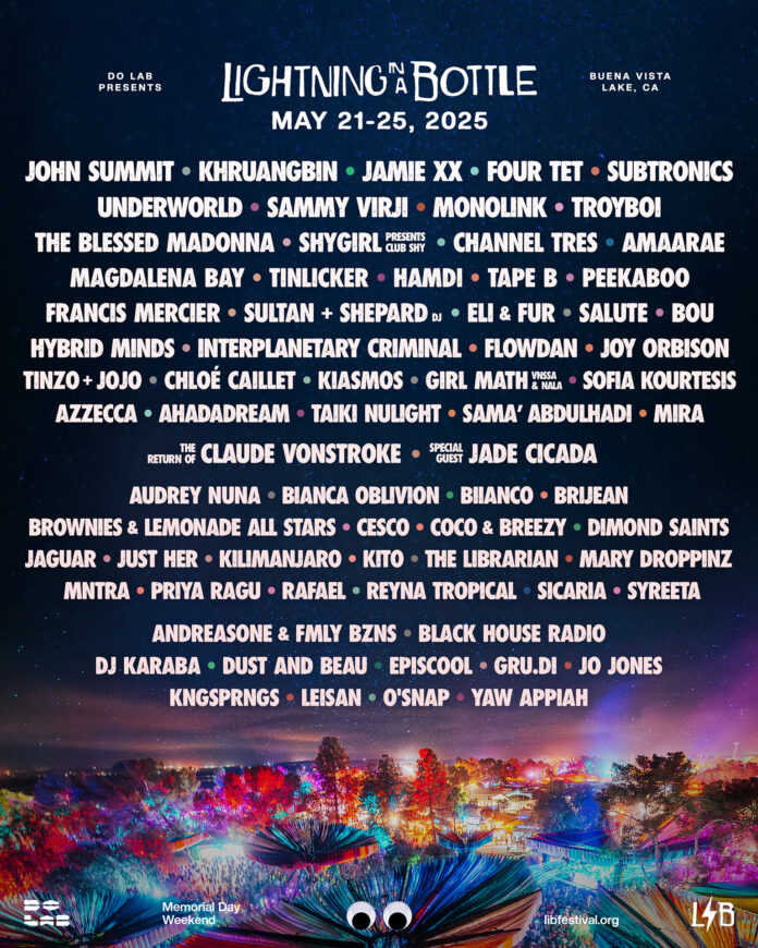 Today, Do LaB have announced the music lineup for North America’s original boutique festival, Lightning in a Bottle, returning to Buena Vista Lake in Southern California during Memorial Day Weekend from May 21-25, 2025. LIB is your gateway to the extraordinary, a technicolor beacon for individuality in a monochrome world. It’s a place where outrageousness is currency and fun triumphs over all – a journey hand curated by the counterculturists and party-people of Do LaB, dotted with surprises that continually reimagine what a festival can mean to its attendees. It’s not just about catching Lightning, this is your chance to be the electricity you wish to see in the world and have the best time of your life in the process – are you ready?