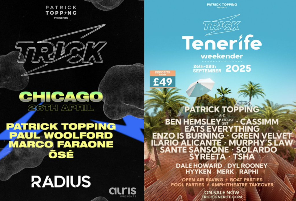 TRICK is more than just a festival — it’s Patrick Topping’s signature party brand that has brought cutting-edge dance music to cities across the globe. From Ibiza to ManchesterBristol, and Barcelona, TRICK has made serious waves with stacked lineups and unforgettable energy. Past editions have featured heavyweights like Eats EverythingDom DollaHannah LaingSchakJosh MickyJohn SummitSarah Story, and Green Velvet B2B Denis Sulta. And the journey continues: TRICK is set to hit Chicago on 26/05/25 and Tenerife on 26/09/25 — bringing the signature TRICK sound to even more dancefloors worldwide. Get your tickets HERE