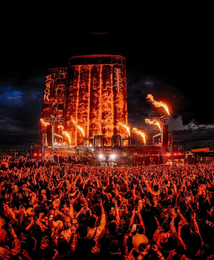 In order to walk to the venue, you have to walk through a park, definitely not something that you’d ever expect out of a venue from the busy New York City. Once you enter the venue, you see the large Red Hook Grain Terminal, and then an open venue space with food trucks and bars on the sides. The stage was massive with screens spread out and pyro flamethrowers ready to shoot through the night.