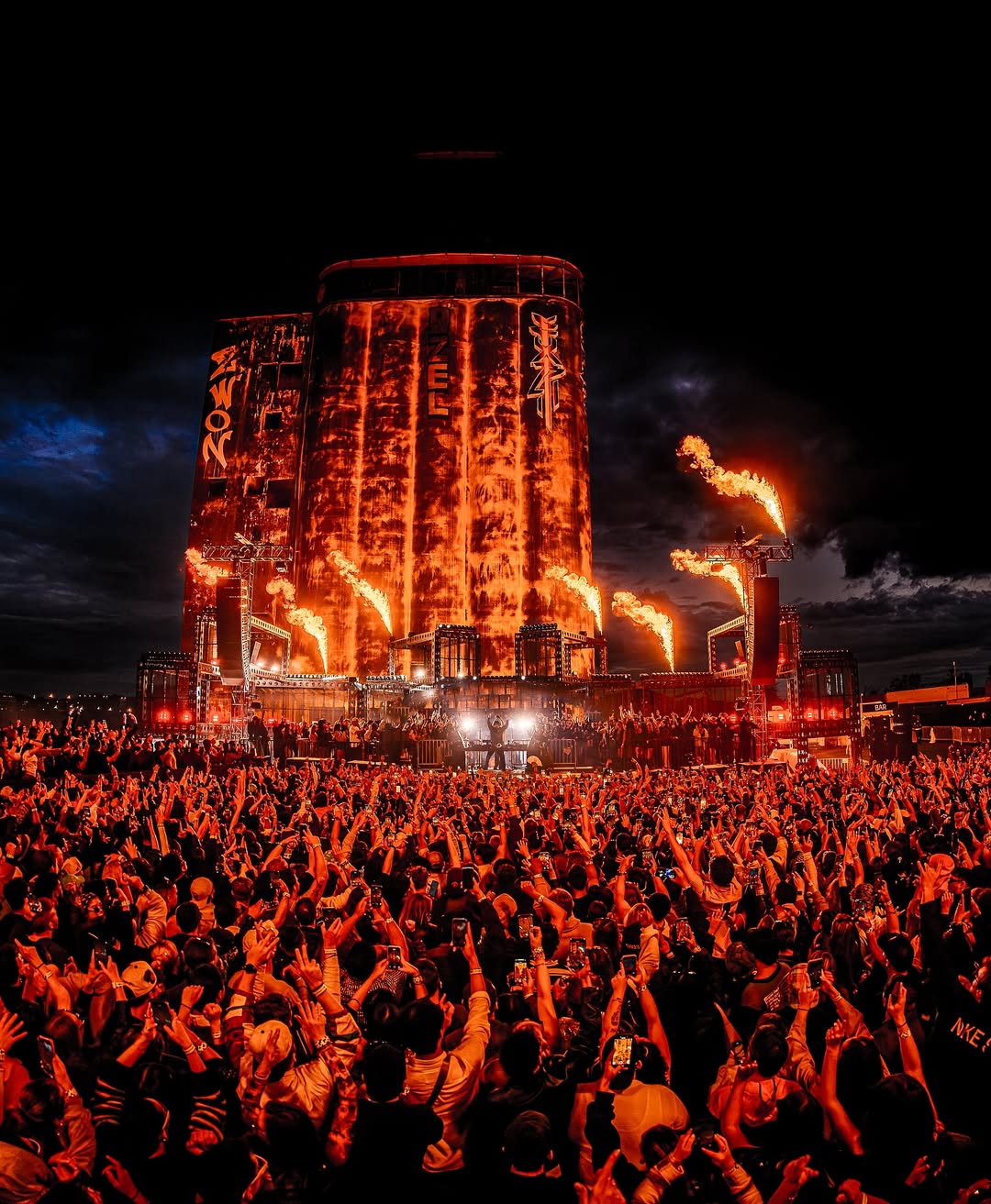 In order to walk to the venue, you have to walk through a park, definitely not something that you’d ever expect out of a venue from the busy New York City. Once you enter the venue, you see the large Red Hook Grain Terminal, and then an open venue space with food trucks and bars on the sides. The stage was massive with screens spread out and pyro flamethrowers ready to shoot through the night.